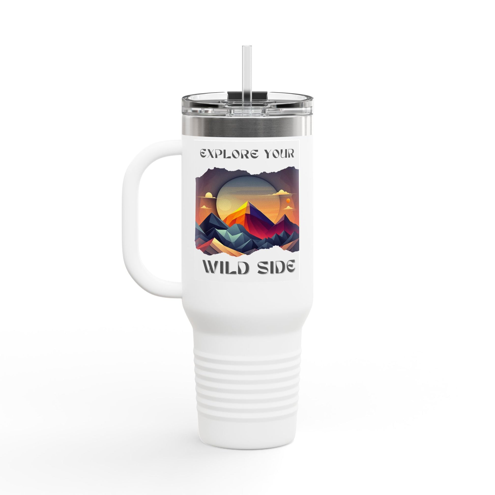 Fuel your adventures with this 40oz Mountain Tumbler. A "Explore Your Wild Side" graphic and sunset mountain scene decorate this rugged stainless steel travel mug.