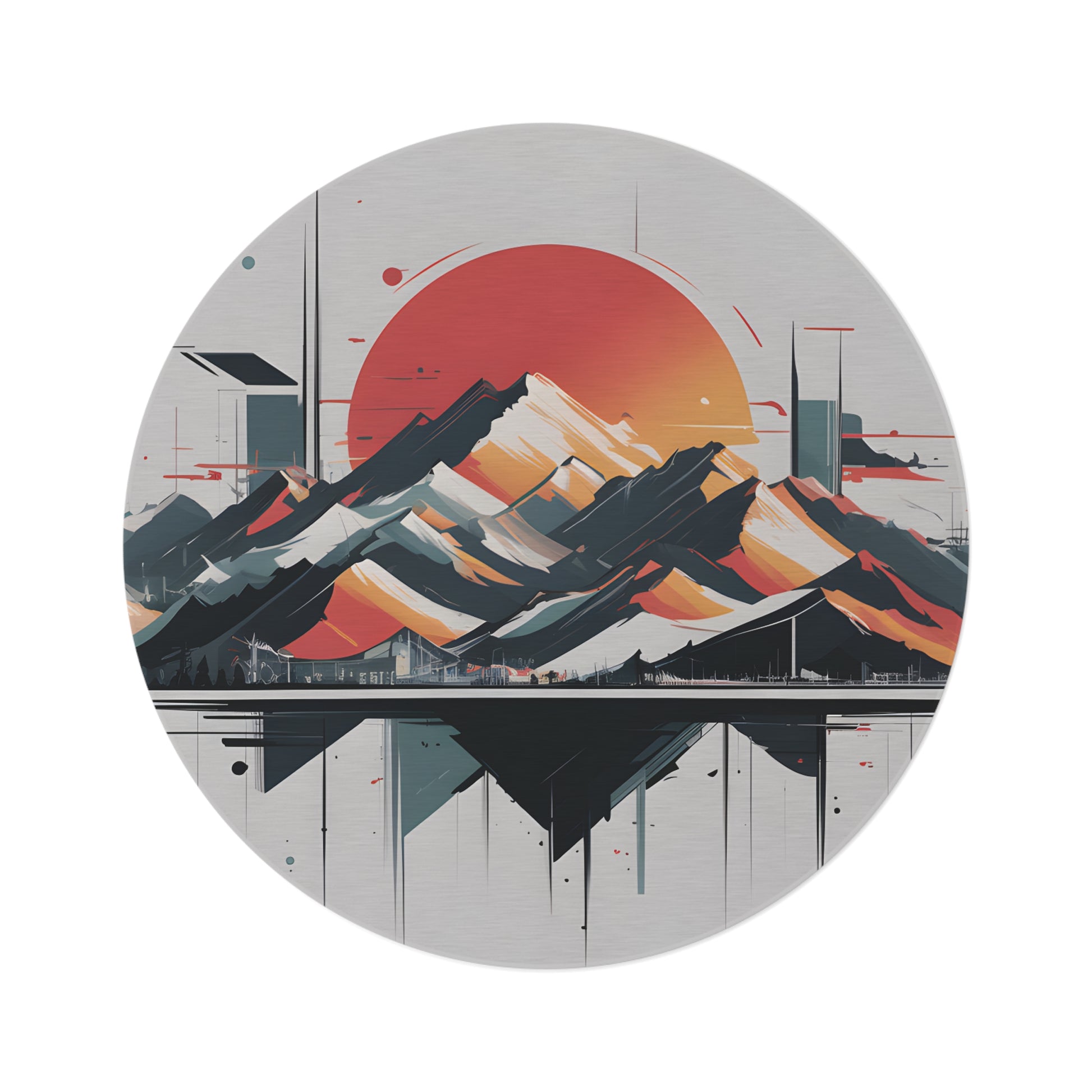 Ground your space with this Modern Geometric Mountain Rug. Deep orange, gray, and black shapes form a stylized sun and mountain motif, adding warmth and art to any room.