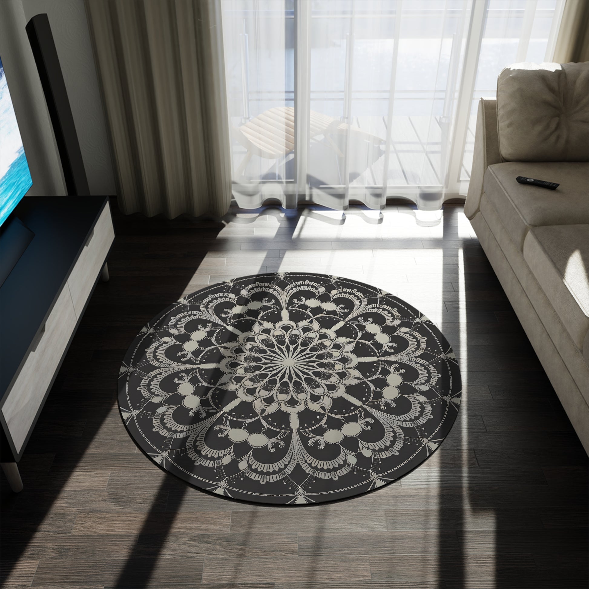 Anchor your room with the sophisticated calm of this 60-Inch Round Mandala Rug. Intricate geometric floral patterns in black and gray create a modern bohemian statement that complements any decor.