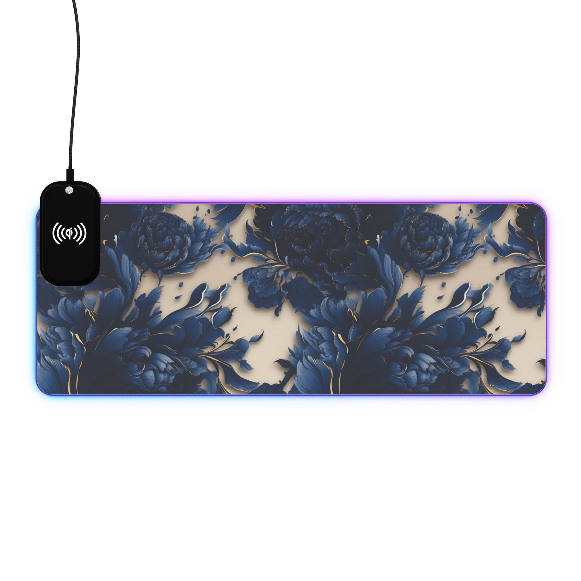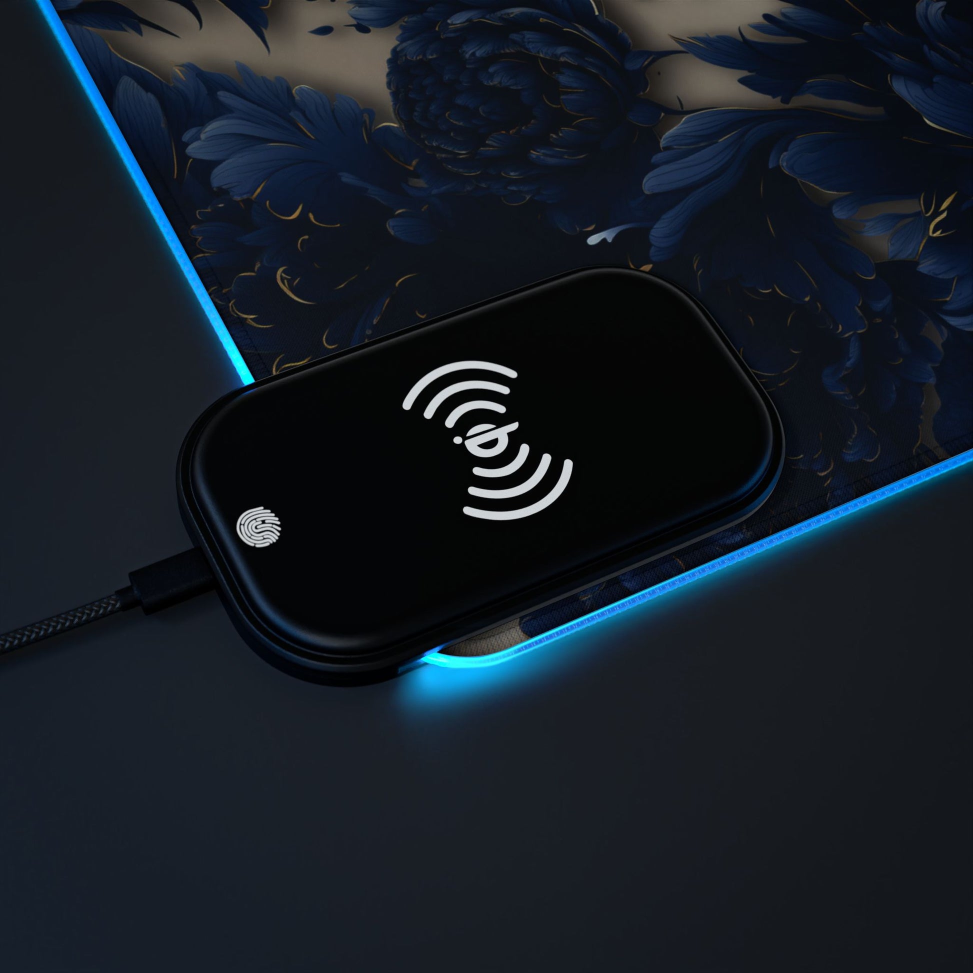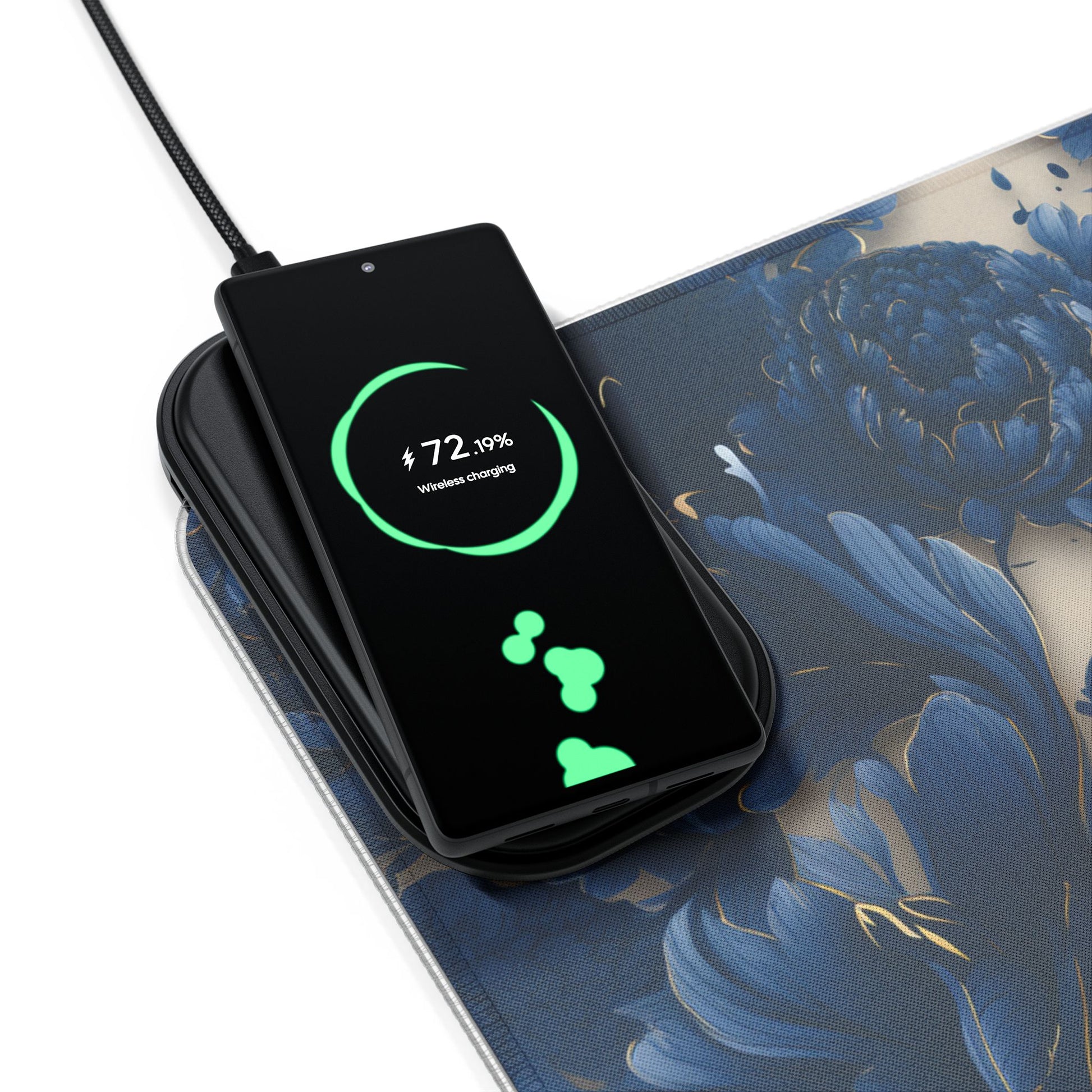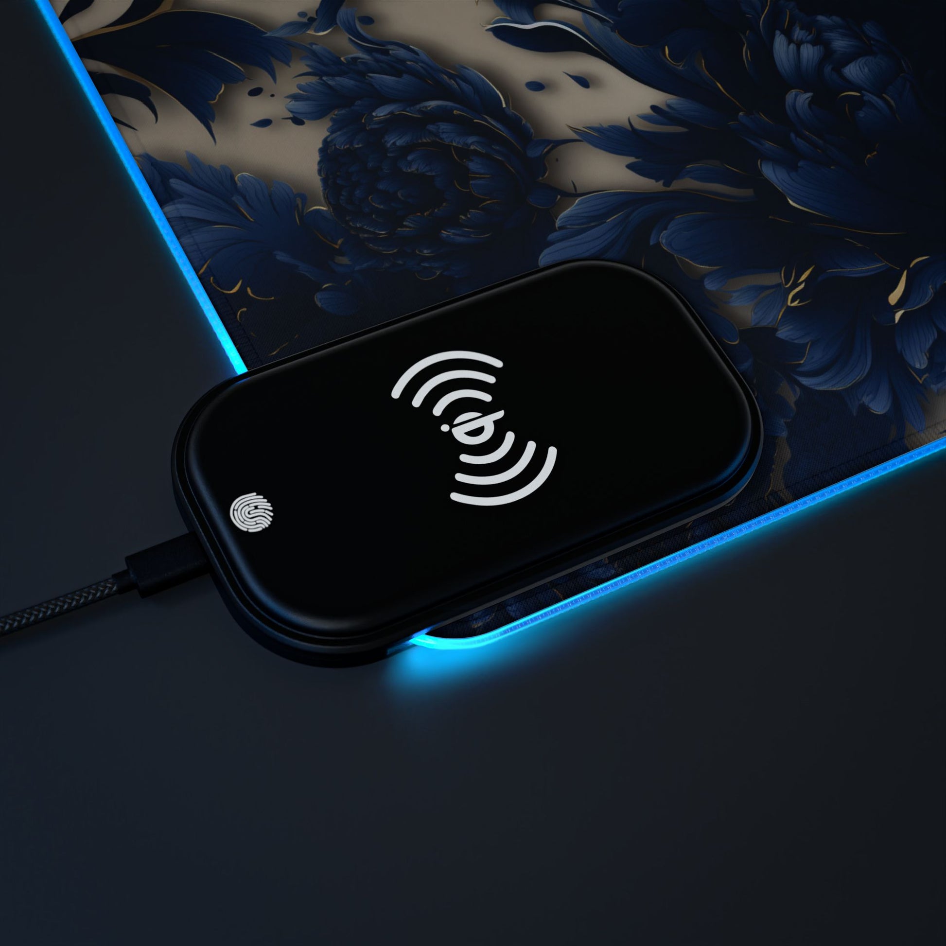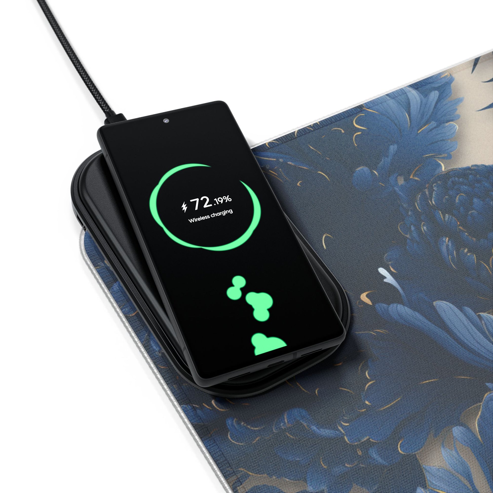 Combine calming art with high tech using this Artistic Floral RGB Mouse Pad. A serene blue-on-beige floral design meets a built-in 15W Qi wireless charger for effortless power.