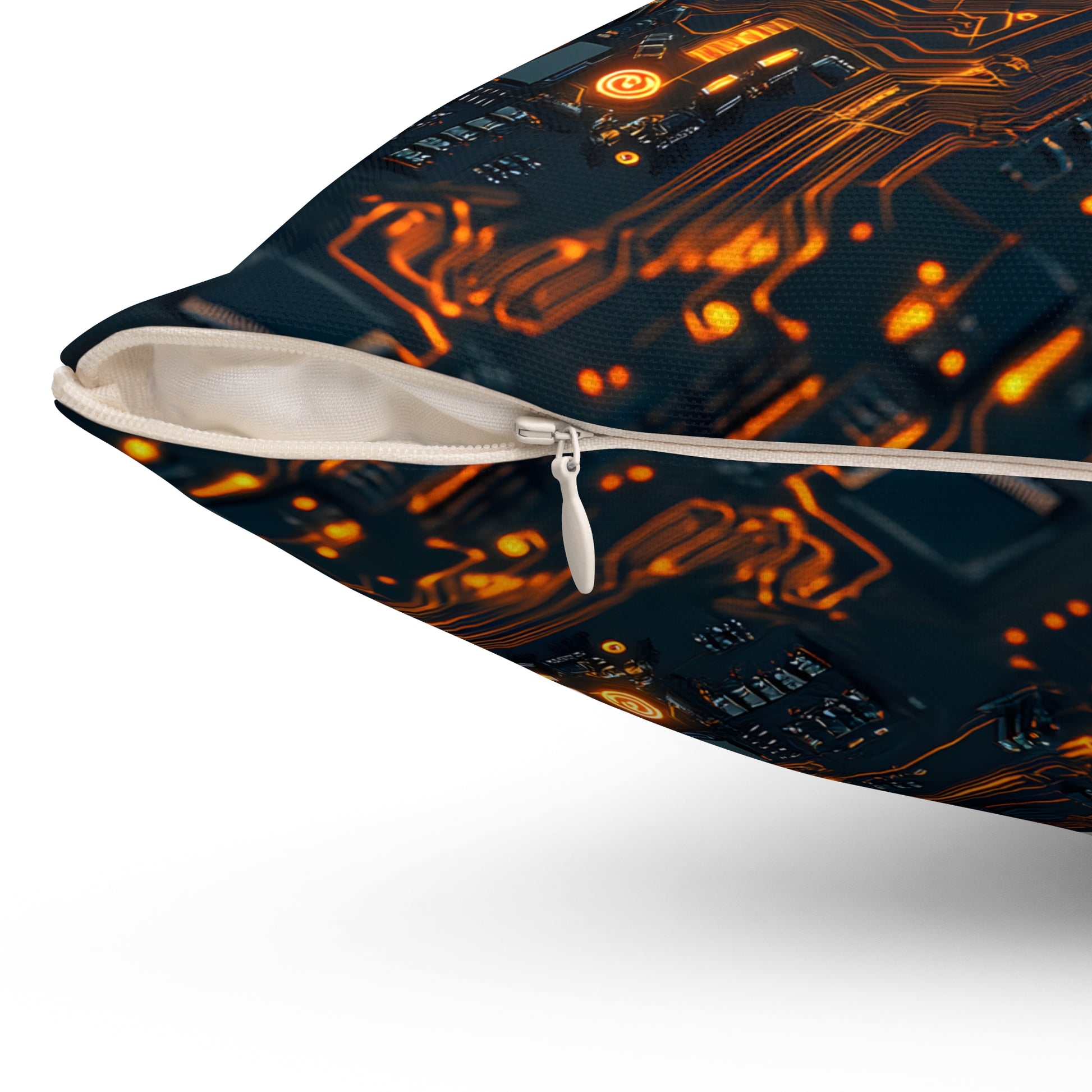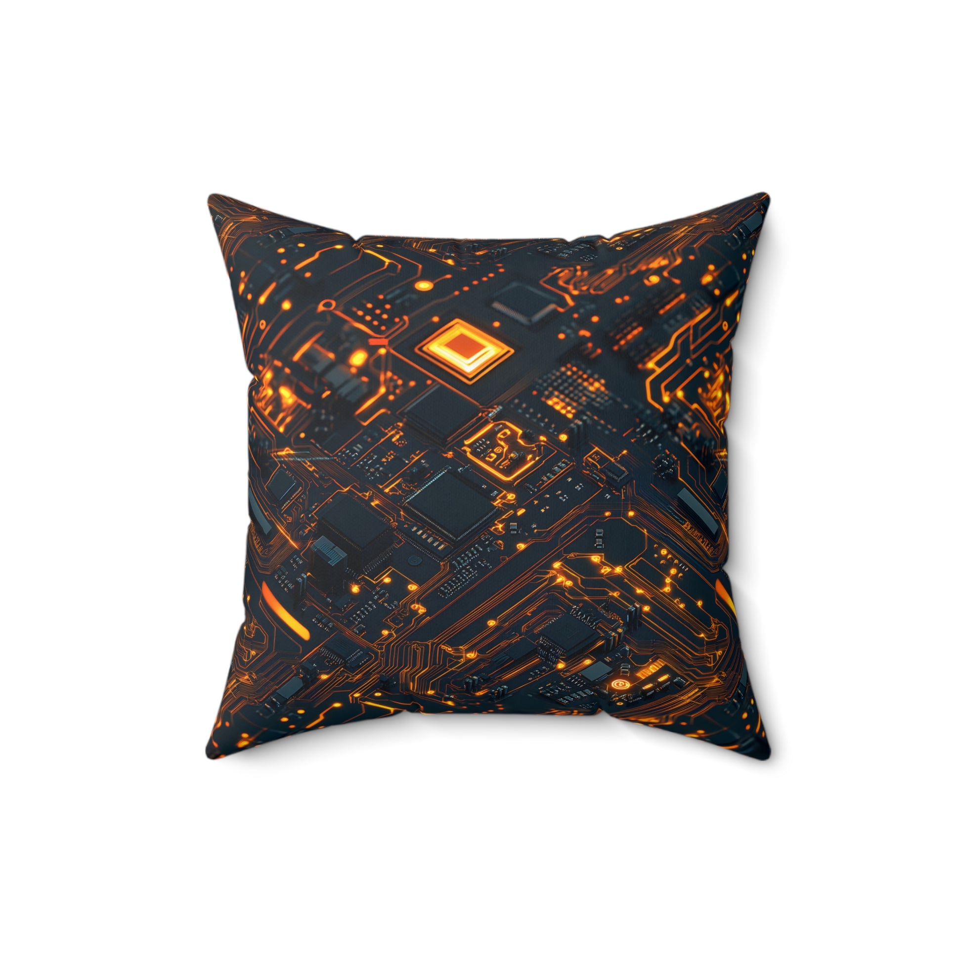 Fuse technology and modern design with our stunning Circuit Board Throw Pillow. The ultimate statement piece for any innovative living space, gaming room, or office, this tech-themed cushion features a mesmerizing geometric pattern of intricate orange and yellow circuits against a deep black background.