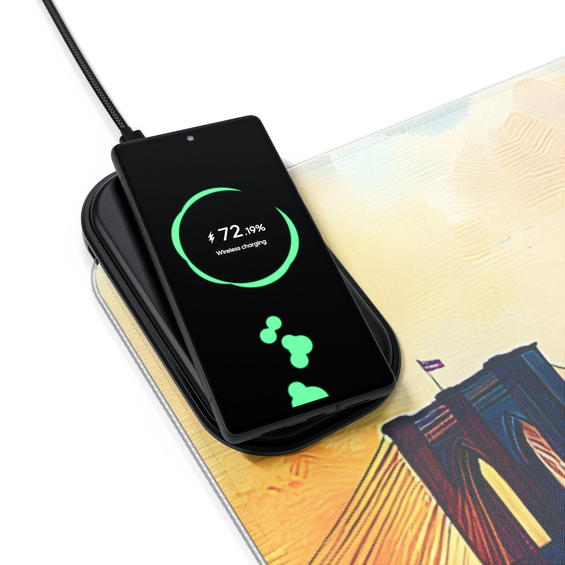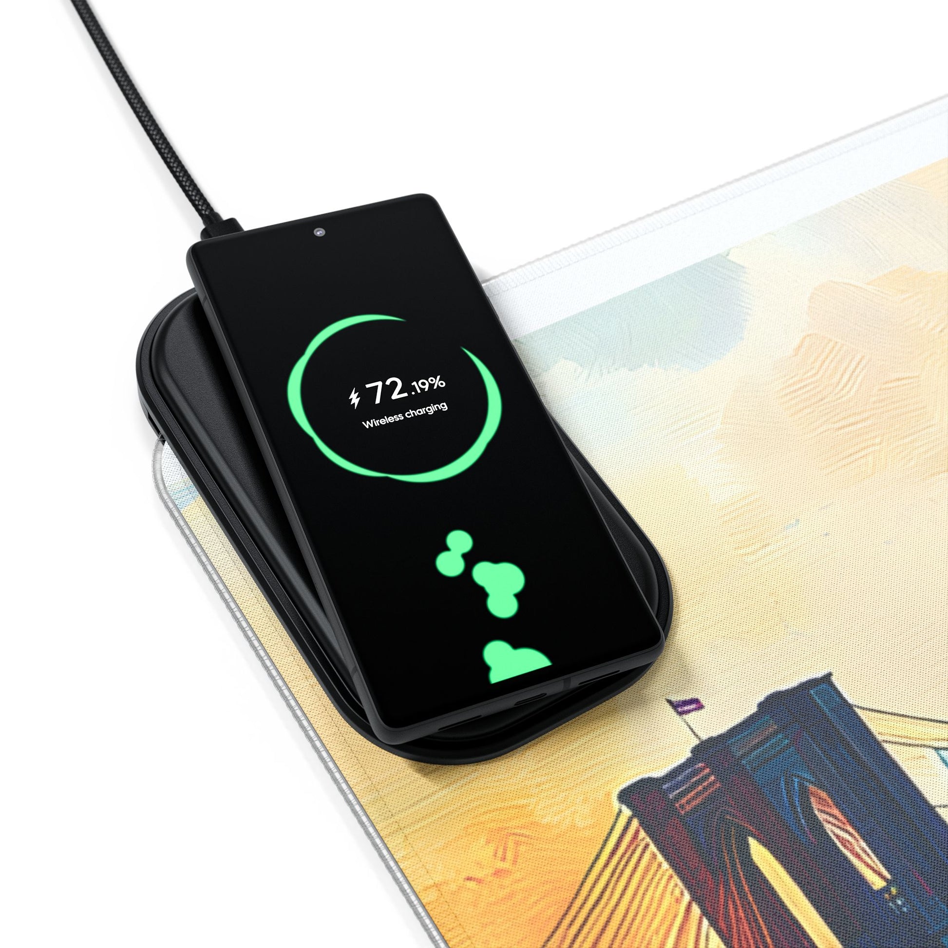 Light up your desk with this Cityscape RGB Gaming Mouse Pad featuring built-in 15W Qi Wireless Charging. A vivid sunset cityscape design wraps your workspace in color, while soft customizable RGB lighting sets the mood.