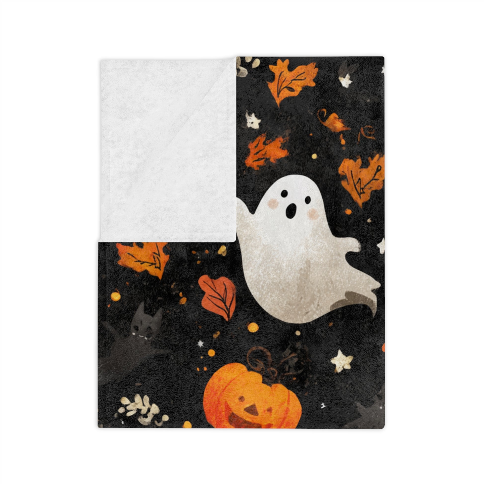 Cozy Halloween Throw Blanket - Velveteen Microfiber with Cute Ghosts & Pumpkins | Night-Sky Black
