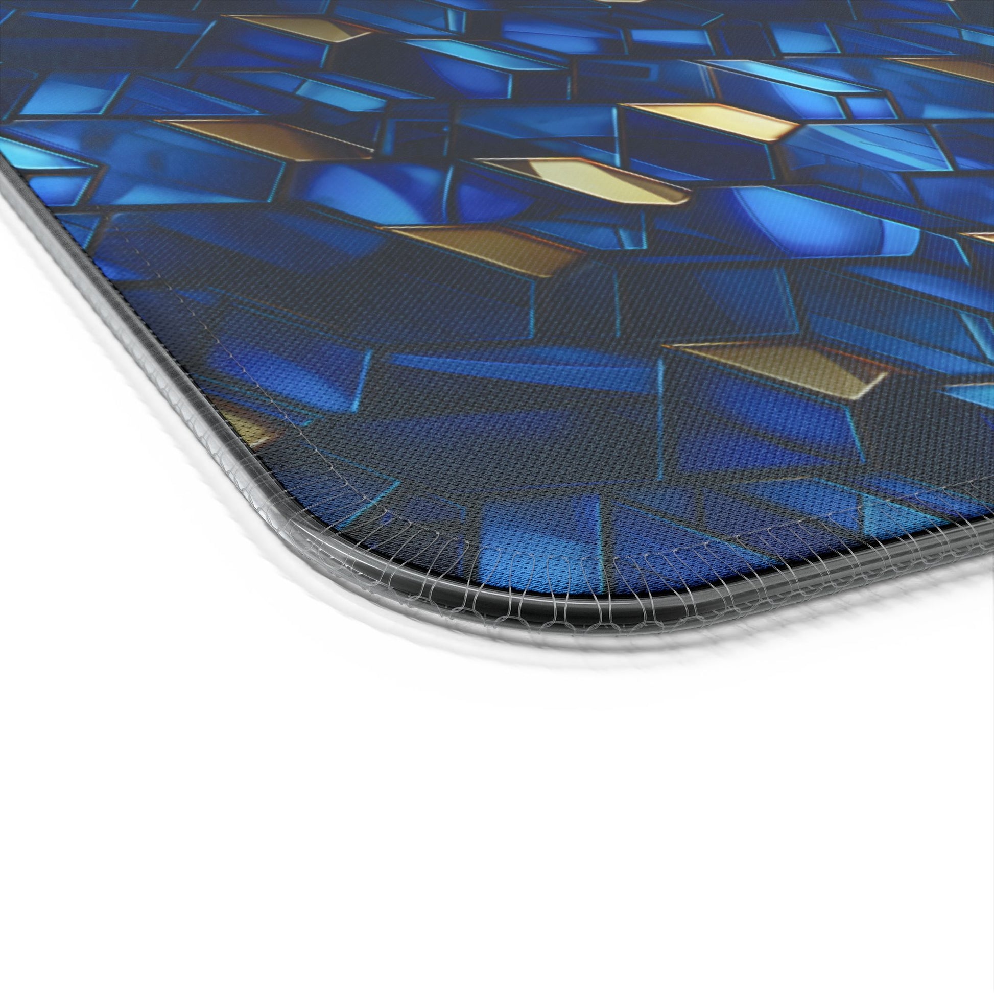 Power up your play with this RGB Gaming Mouse Pad. A sophisticated blue and gold geometric design covers a smooth performance surface, enhanced by custom edge lighting.
