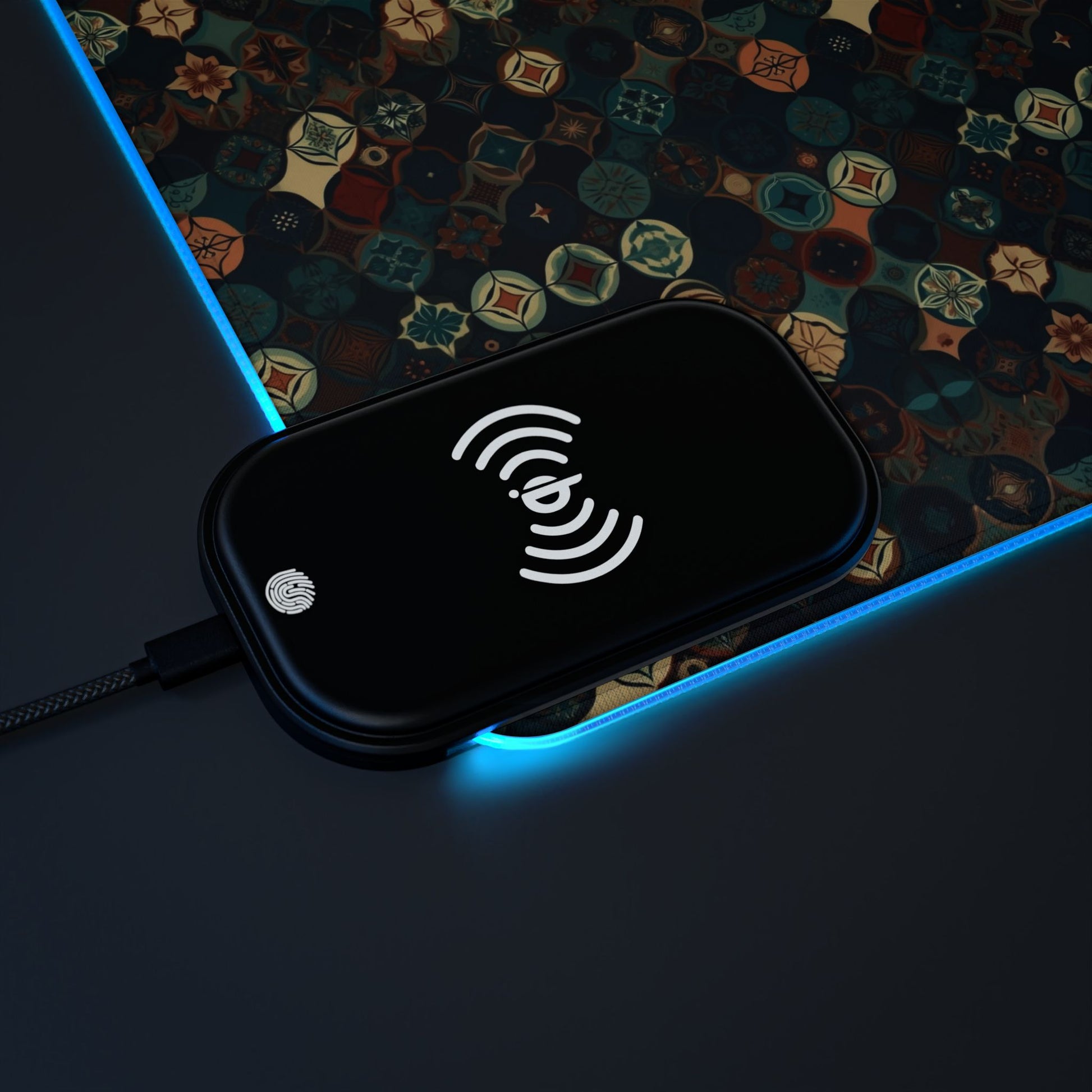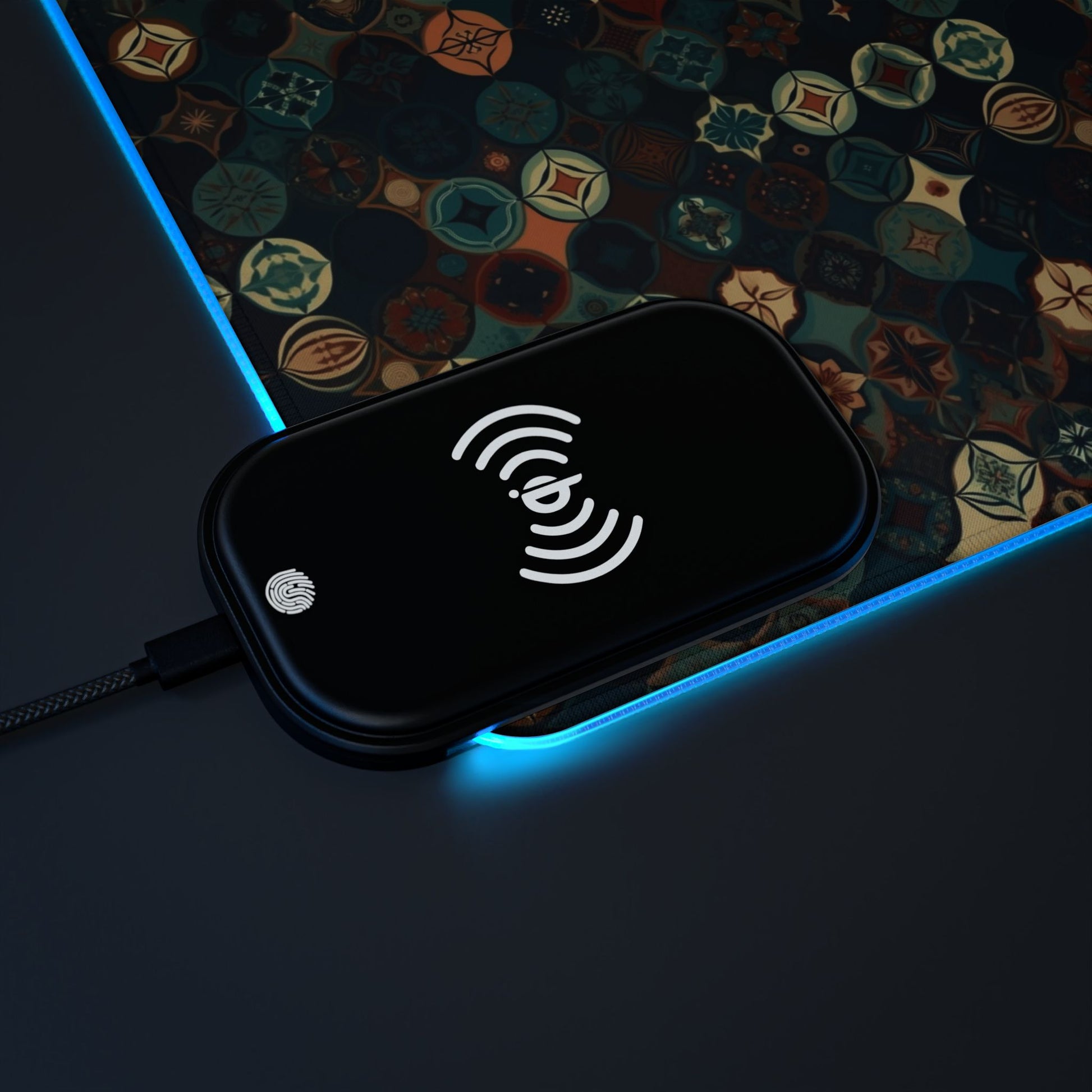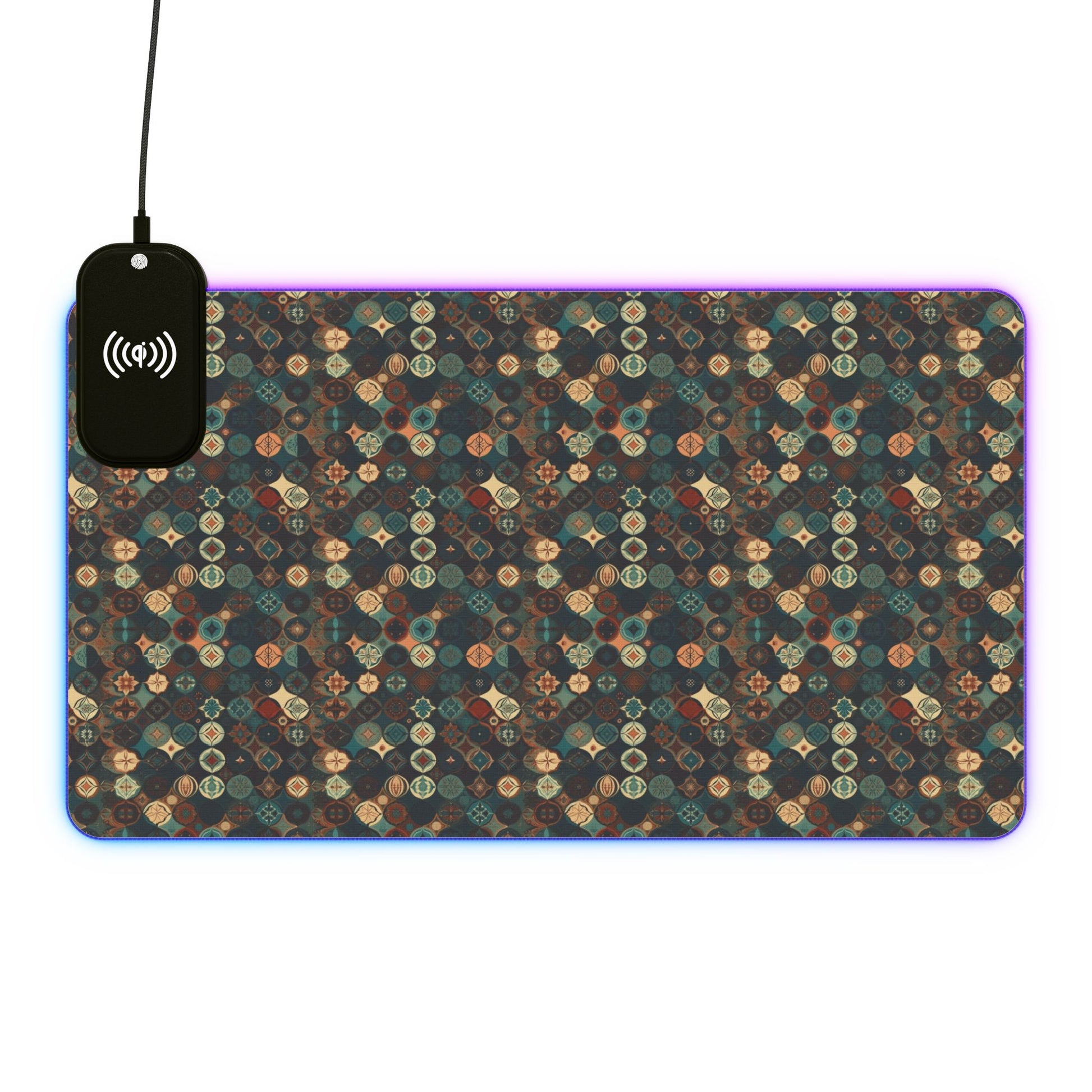 Combine style and power with this RGB Gaming Mouse Pad. Featuring a sophisticated teal, brown, and gold geometric design, it includes a built-in 15W Qi wireless charger to keep your devices ready.