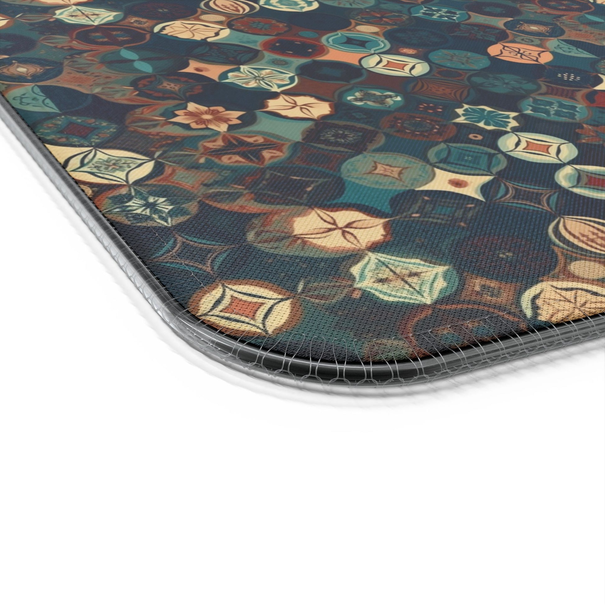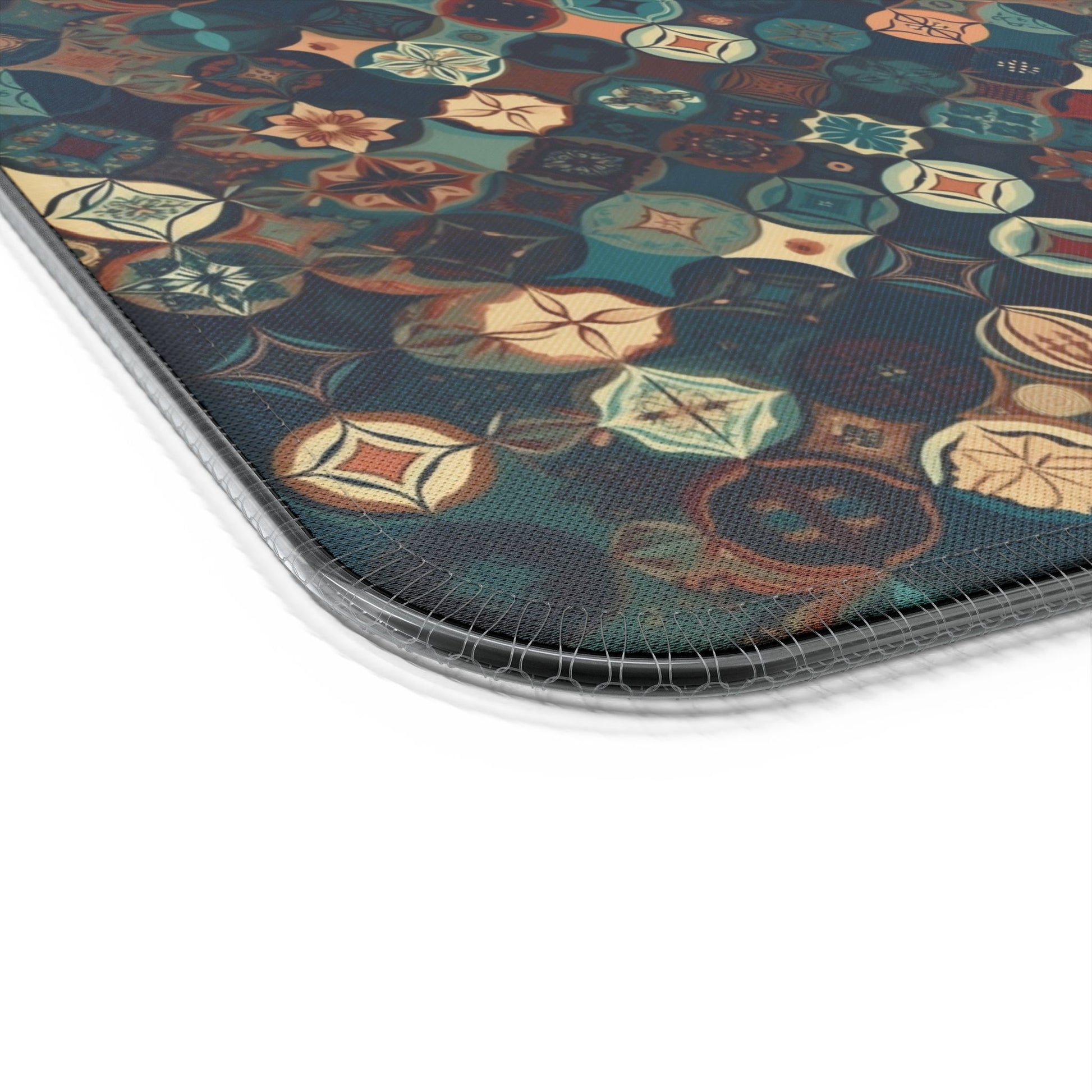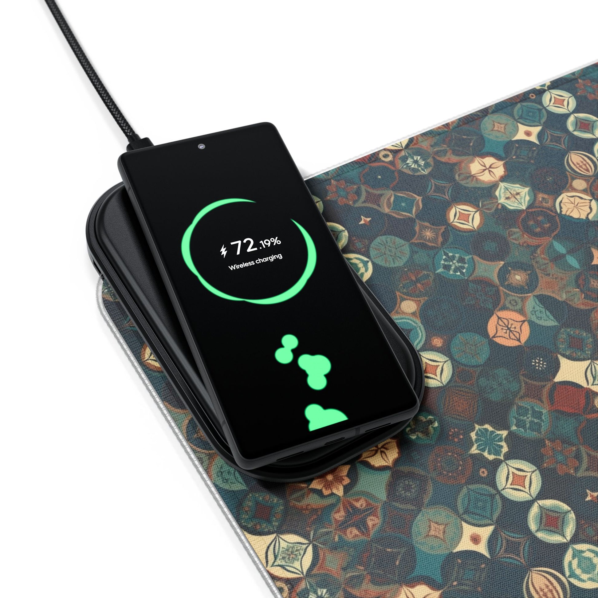 Combine style and power with this RGB Gaming Mouse Pad. Featuring a sophisticated teal, brown, and gold geometric design, it includes a built-in 15W Qi wireless charger to keep your devices ready.