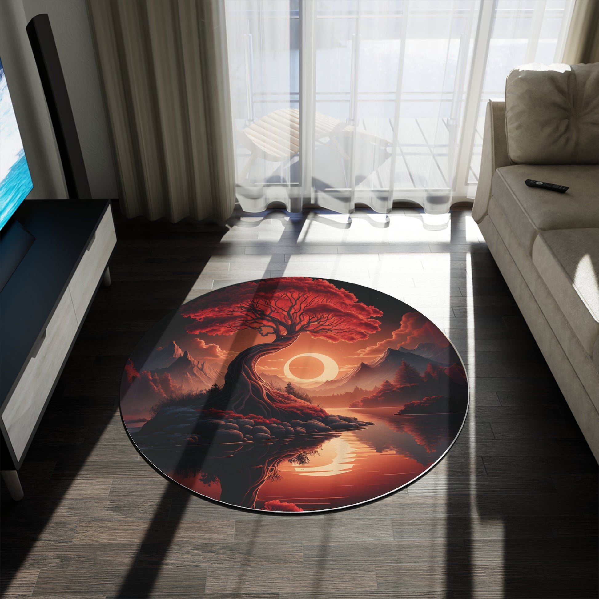 Imagine the warmth of a setting sun radiating from your floor. The high-resolution print features a twisting, stylized tree with fiery red foliage perched upon a jagged rock. A glowing, partially eclipsed sun casts a warm orange light over mist-covered mountains and a reflective lake, creating a symmetrical visual experience that adds depth and intrigue to your decor. The rich palette of crimson, deep orange, black, and muted purple commands attention without overwhelming your existing furniture.