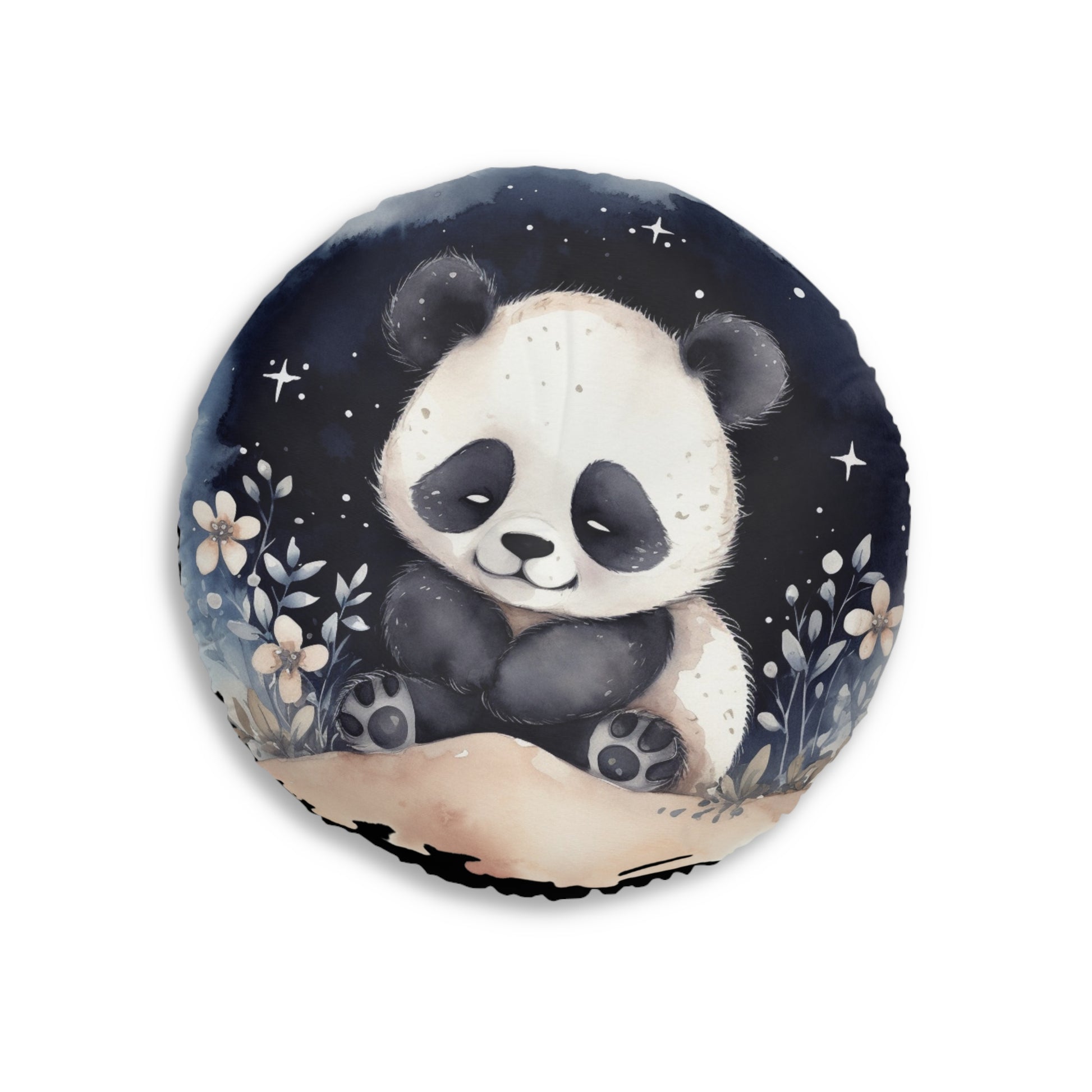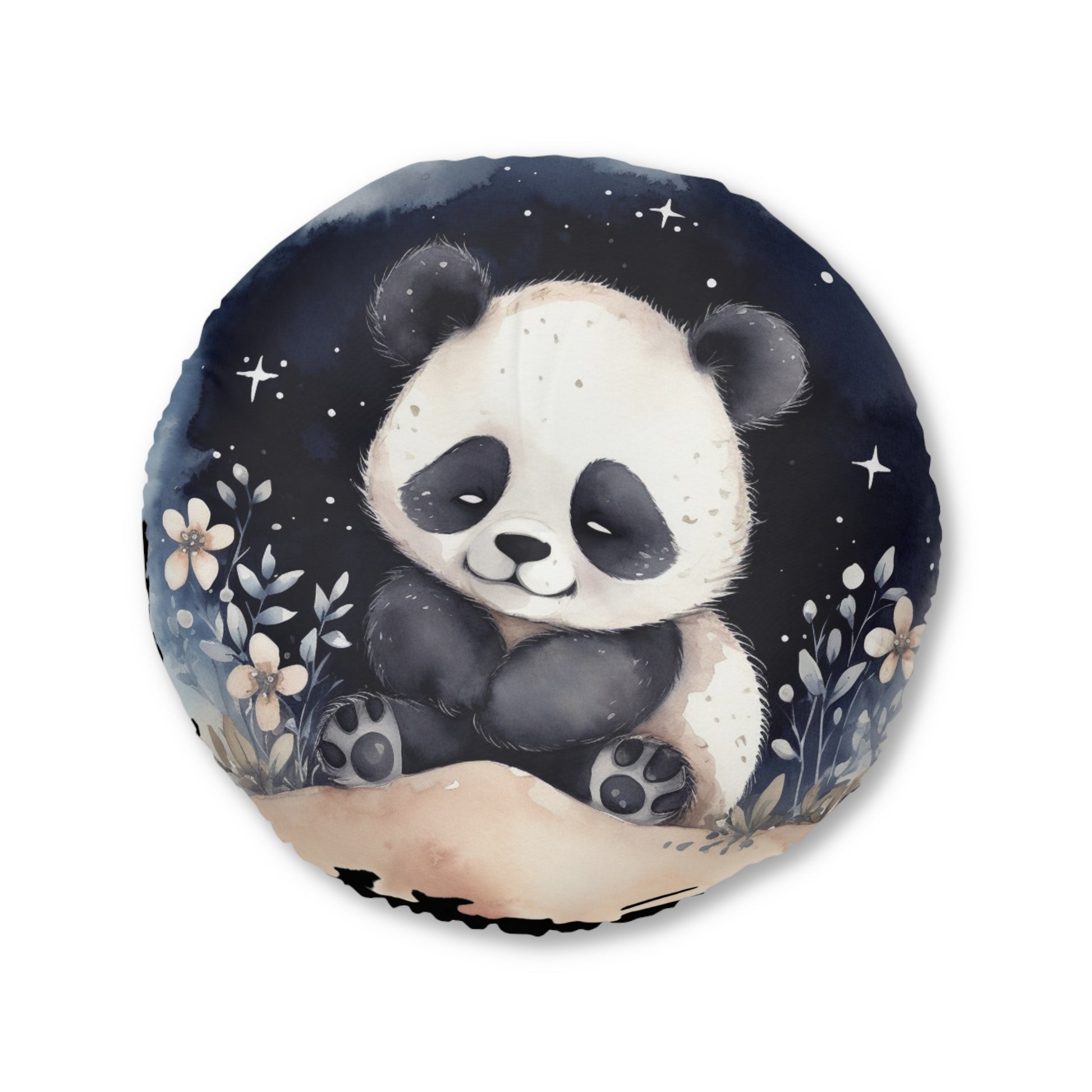 Bring storybook calm to your space with this plush, round tufted floor pillow featuring a sleepy baby panda under a starry indigo sky. Designed for cozy extra seating, it’s cloud-soft yet supportive. The watercolor artwork wraps across the face and around the sides. Why you’ll love it: Cozy, supportive seating; Whimsical watercolor panda and night-sky design; Double-sided print. Details: Shape & finish: Round floor cushion with lightly tufted top; Materials: 100% polyester body and filling. Palette: Deep navy/indigo, creamy white and charcoal panda.