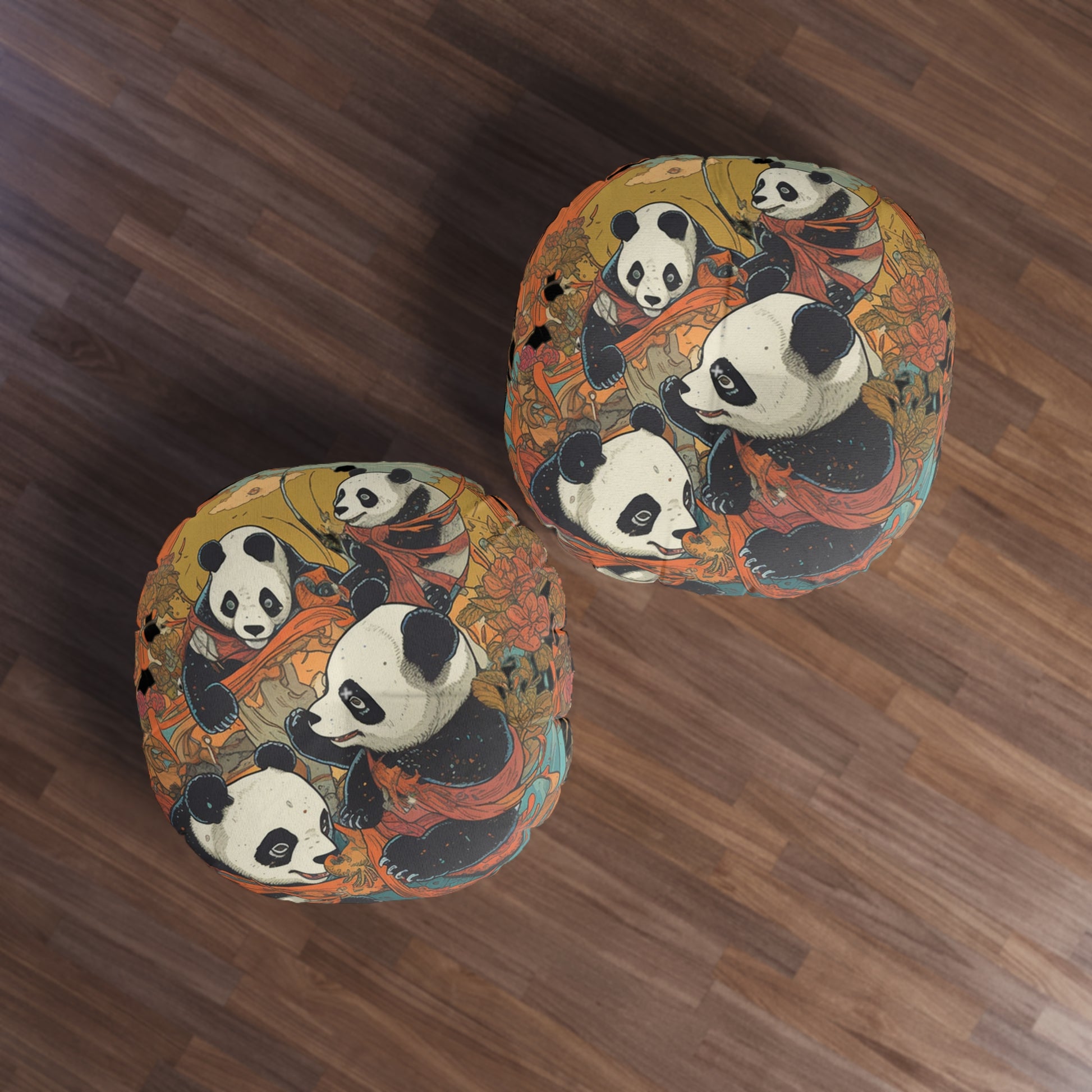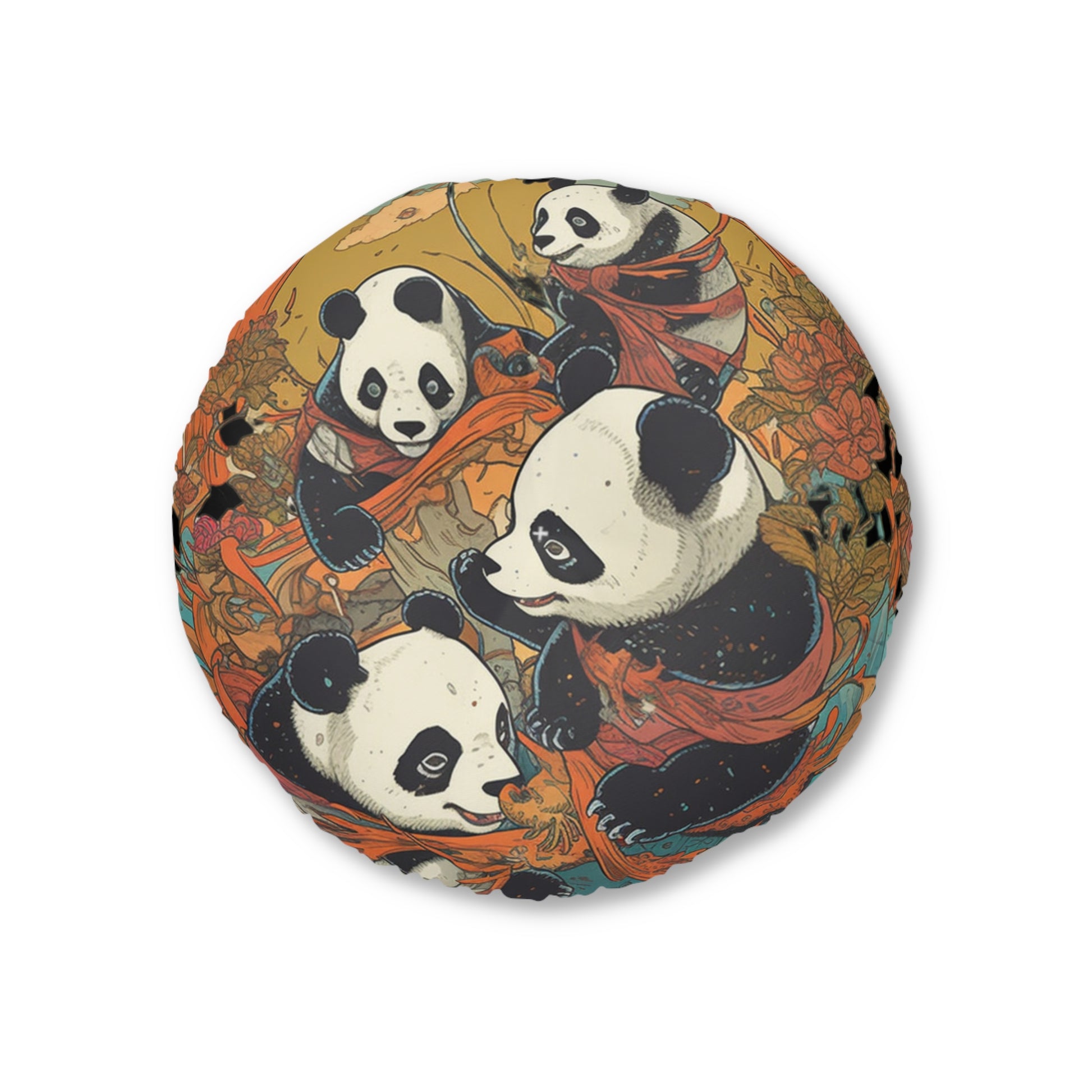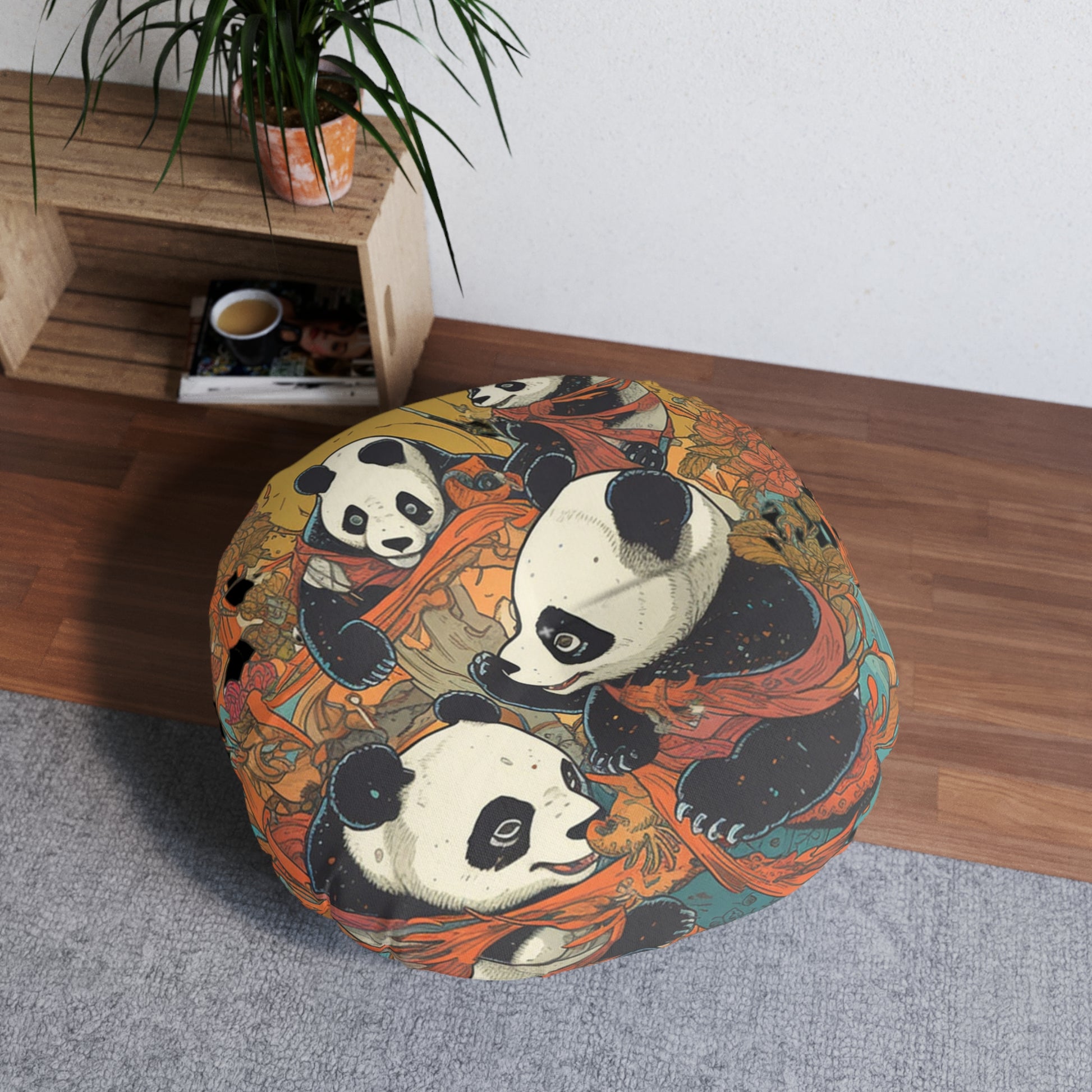 Set the tone for cozy, bohemian living with this round tufted panda floor pillow. Plush and supportive with a low-profile pouf shape, it offers comfortable floor seating while its storybook-style panda art and warm, earthy palette bring instant personality to your space. Why you’ll love it: Comfort you can feel; Art that warms the room: Hand-drawn pandas dance among florals; Beautiful from every angle. Details: Shape & construction: Round, tufted floor cushion with softly rounded sides; Materials: 100% durable polyester body and filling.