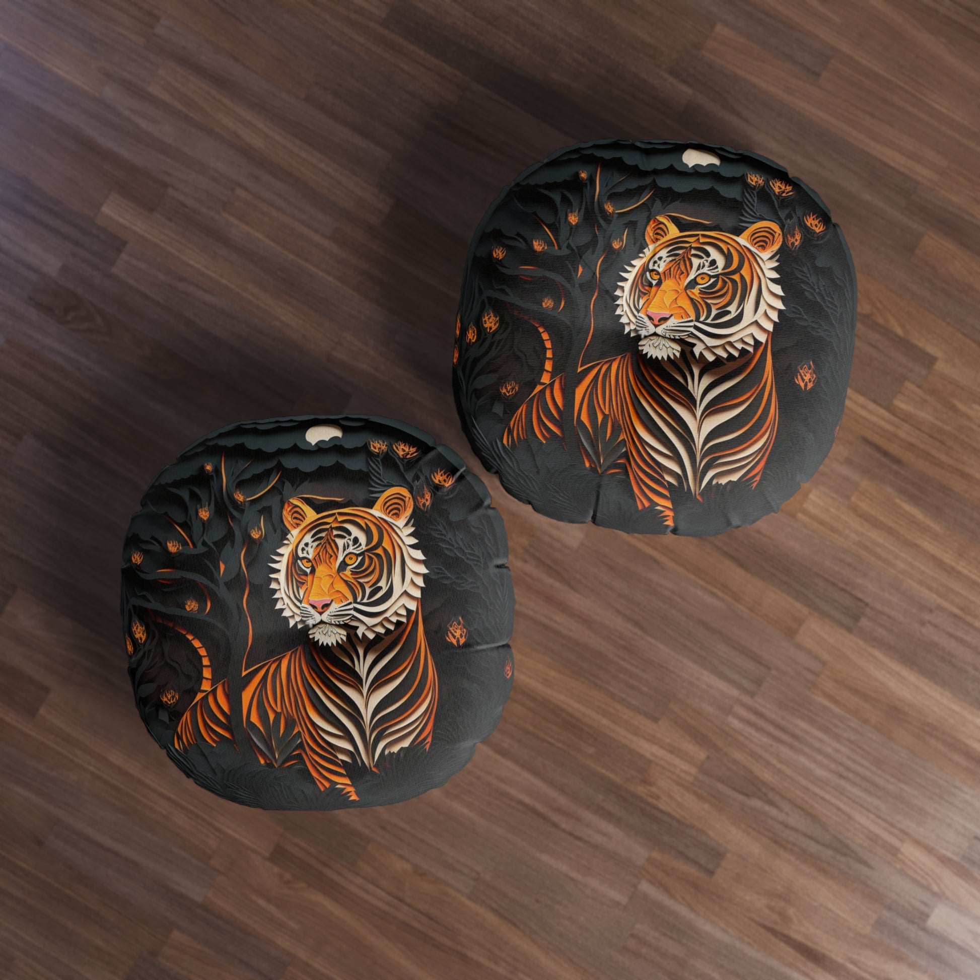 Make a bold, cozy statement with this round tufted floor pillow—where artful tiger imagery meets plush, low floor seating. The richly saturated, double-sided print brings a moonlit jungle to your space, while the generously stuffed, structured silhouette keeps you comfortable for lounging. Striking, high-contrast artwork: a vivid orange-and-cream tiger in a layered paper-cut style against a charcoal night jungle. Details: Style: Round tufted floor pillow; Print: Full-coverage, high-saturation, double-sided; Materials: Smooth polyester exterior; sturdy polyester fill.