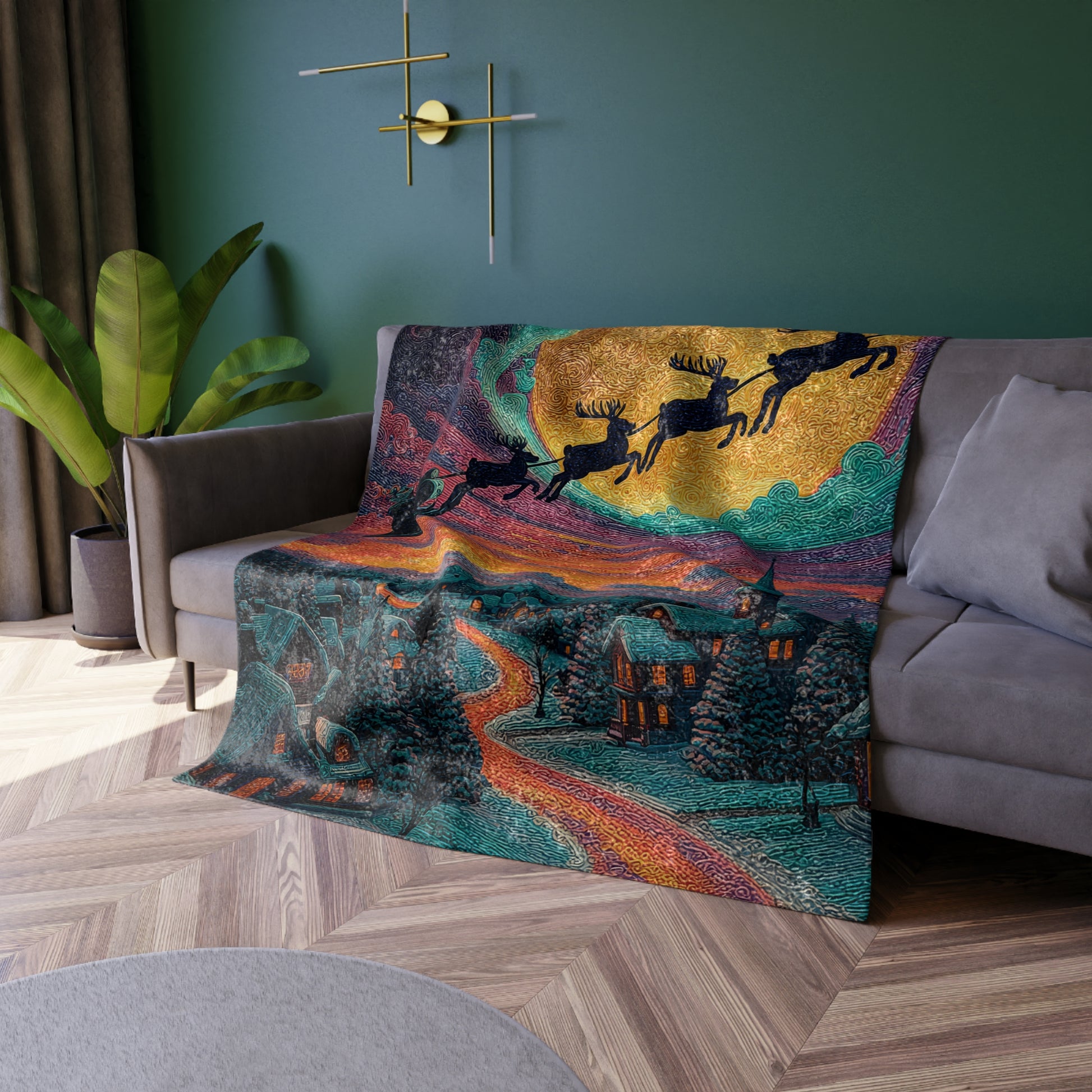 Santa Sleigh and Reindeer Crushed Velvet Blanket | Christmas Nightscape