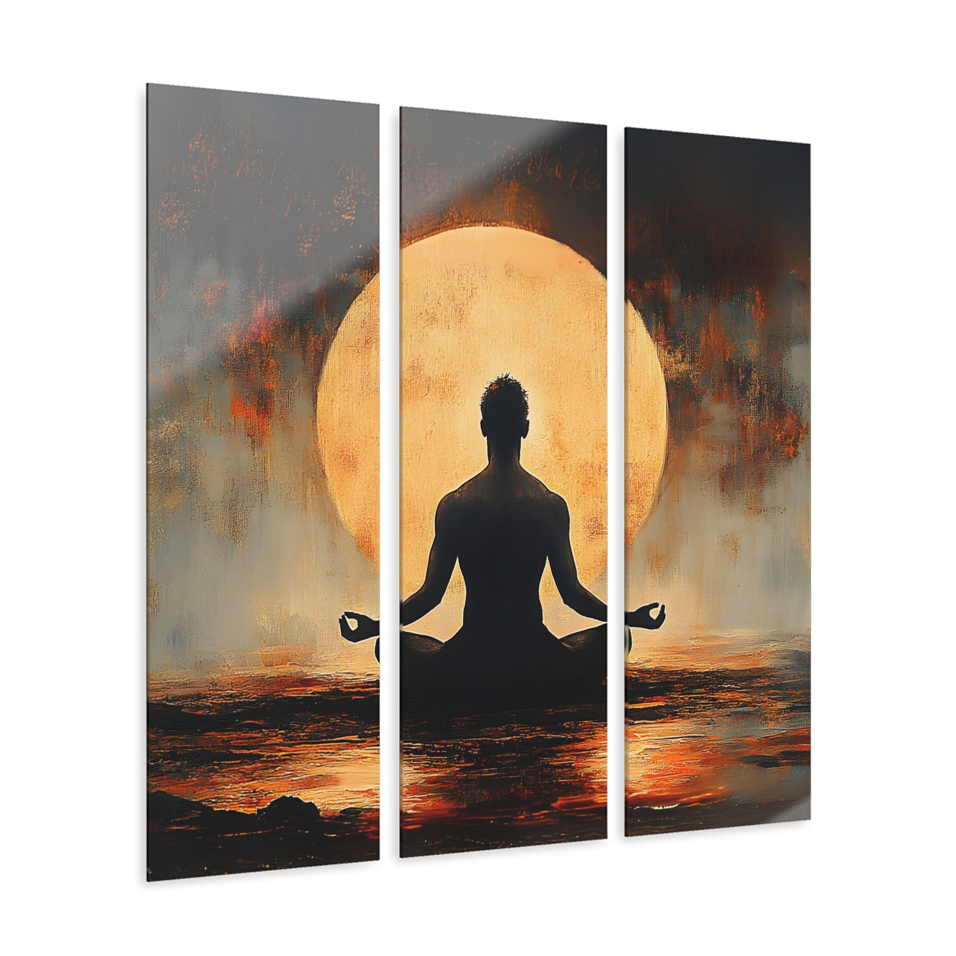 Invoke mindfulness with this Zen Meditation Sun Silhouette Acrylic Triptych. A peaceful figure meditating against a radiant orange and gold sun creates a warm, spiritual focal point.